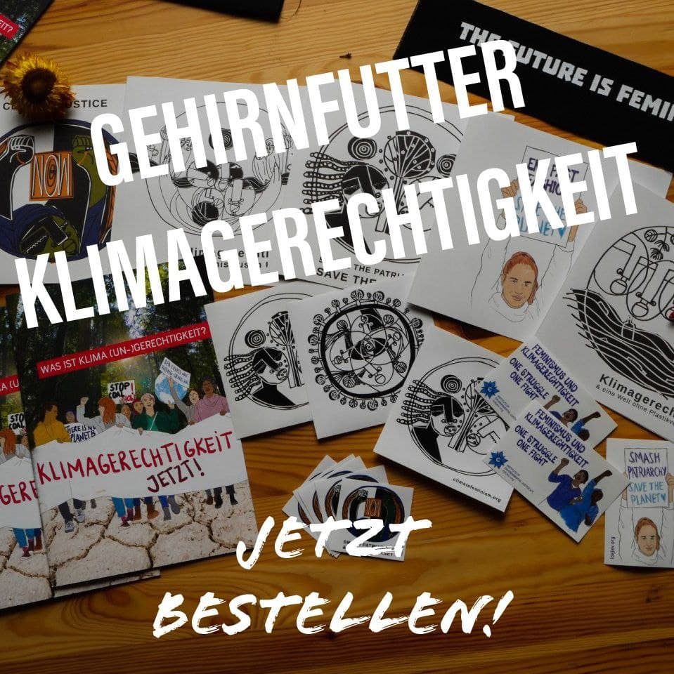 In unserem „Klimagerechtigkeitspaket“ haben wir bereits eine Auswahl aus dem Online-Shop für euch zusammengestellt, von vielfältigem Bildungsmaterial über Zusatzmaterial wie Flyer zu verschiedenen Themen wie Klimagerechtigkeit & Feminismus, Klima & Flucht oder Klimagerechtigkeit & Fashion und vieles mehr.